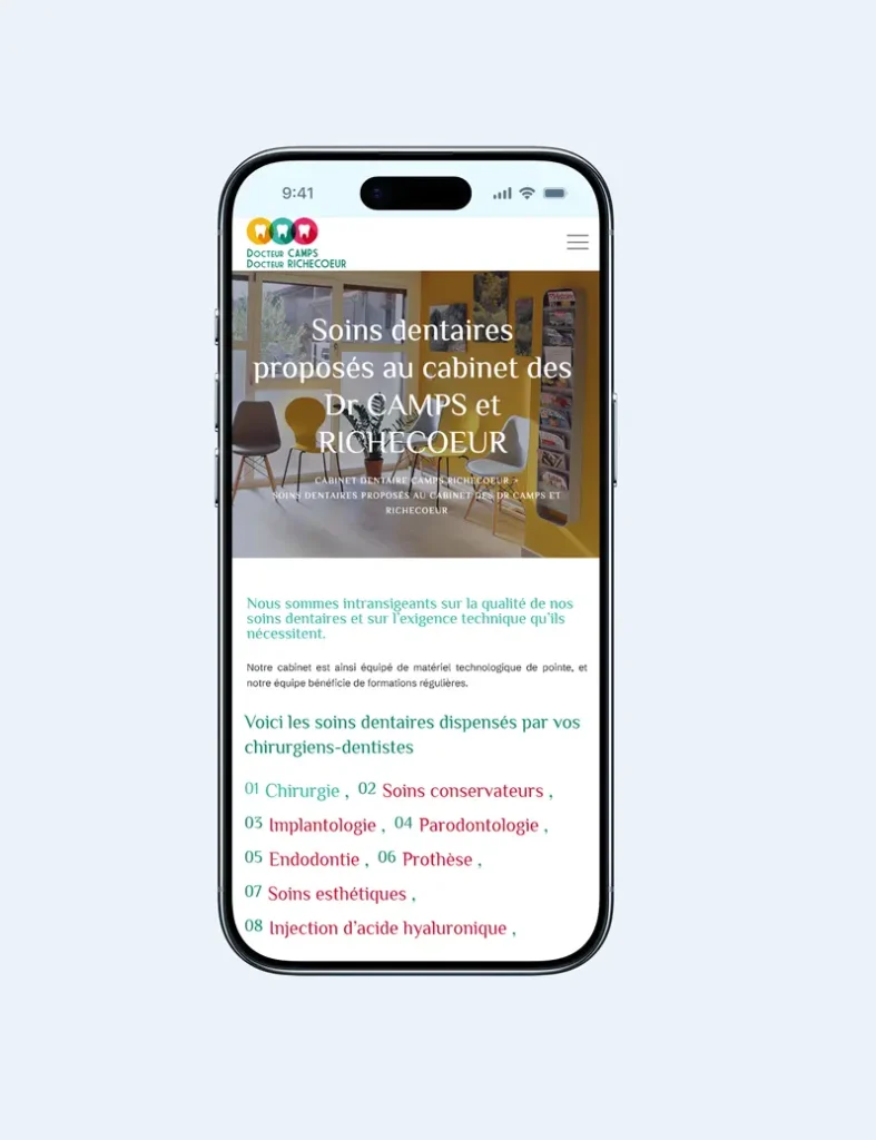 Chez Provensite, nous avons eu le plaisir de collaborer avec le cabinet dentaire des Dr Camps et Richecoeur, deux chirurgiens-dentistes installées à Salon de Provence, pour la création de leur site internet. L’objectif était de proposer une vitrine en ligne moderne, rassurante et pratique, à destination des patients.