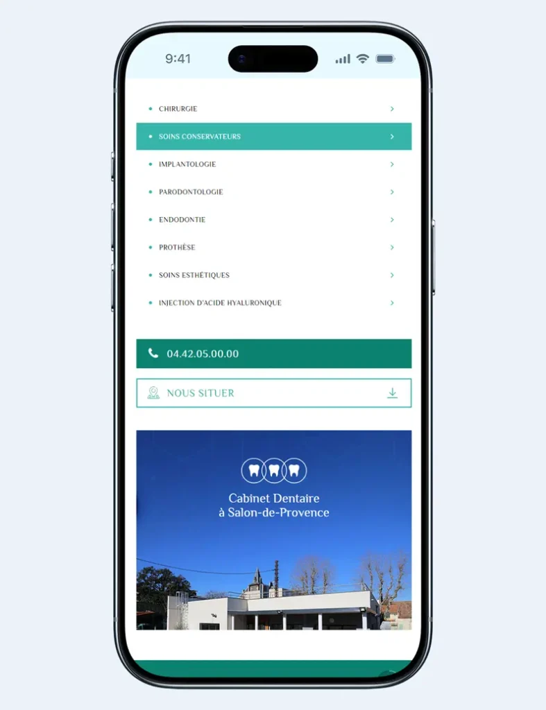 Pour un cabinet dentaire, la visibilité locale est essentielle. Nous avons donc intégré une stratégie SEO locale ciblée sur Salon de Provence et ses environs, afin que le cabinet soit facilement trouvé par les patients recherchant un chirurgien-dentiste à proximité.