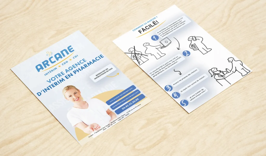 En combinant identité visuelle, supports print, goodies, site internet et référencement, nous avons fourni à Arcane Recrutement une solution complète de communication et de marketing, renforçant sa crédibilité et sa notoriété. Chaque élément a été pensé pour transmettre confiance, sérieux et professionnalisme, tout en facilitant le recrutement des meilleurs profils dans le secteur pharmaceutique.